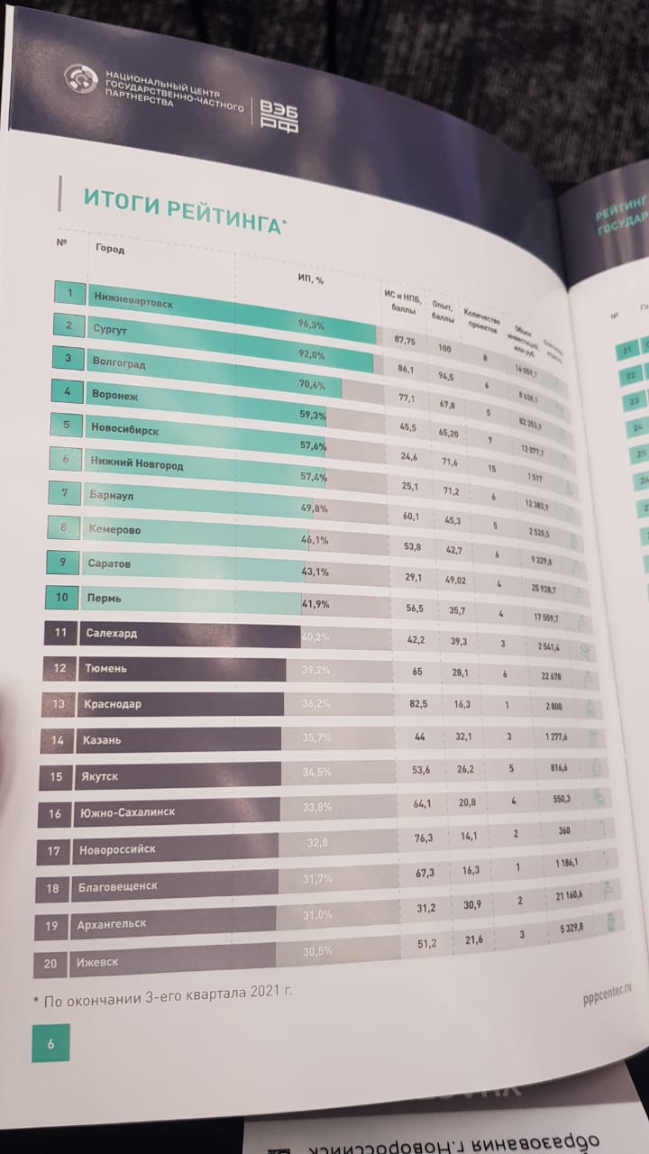 По итогам 3 квартала 2021 года Новороссийск занимает 17 место среди 110 крупнейших городов во Всероссийском рейтинге городов по уровню развития ГЧП, поднявшись на 2 строчки по сравнению с итогами 2020 года.