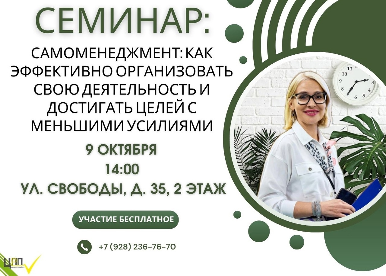 Внимание самозанятым. Центр поддержки предпринимательства г.Новороссийска совместно с «Мой бизнес» Краснодарский край организует семинар: «Самоменеджмент: как эффективно организовать свою деятельность и достигать целей с меньшими усилиями».